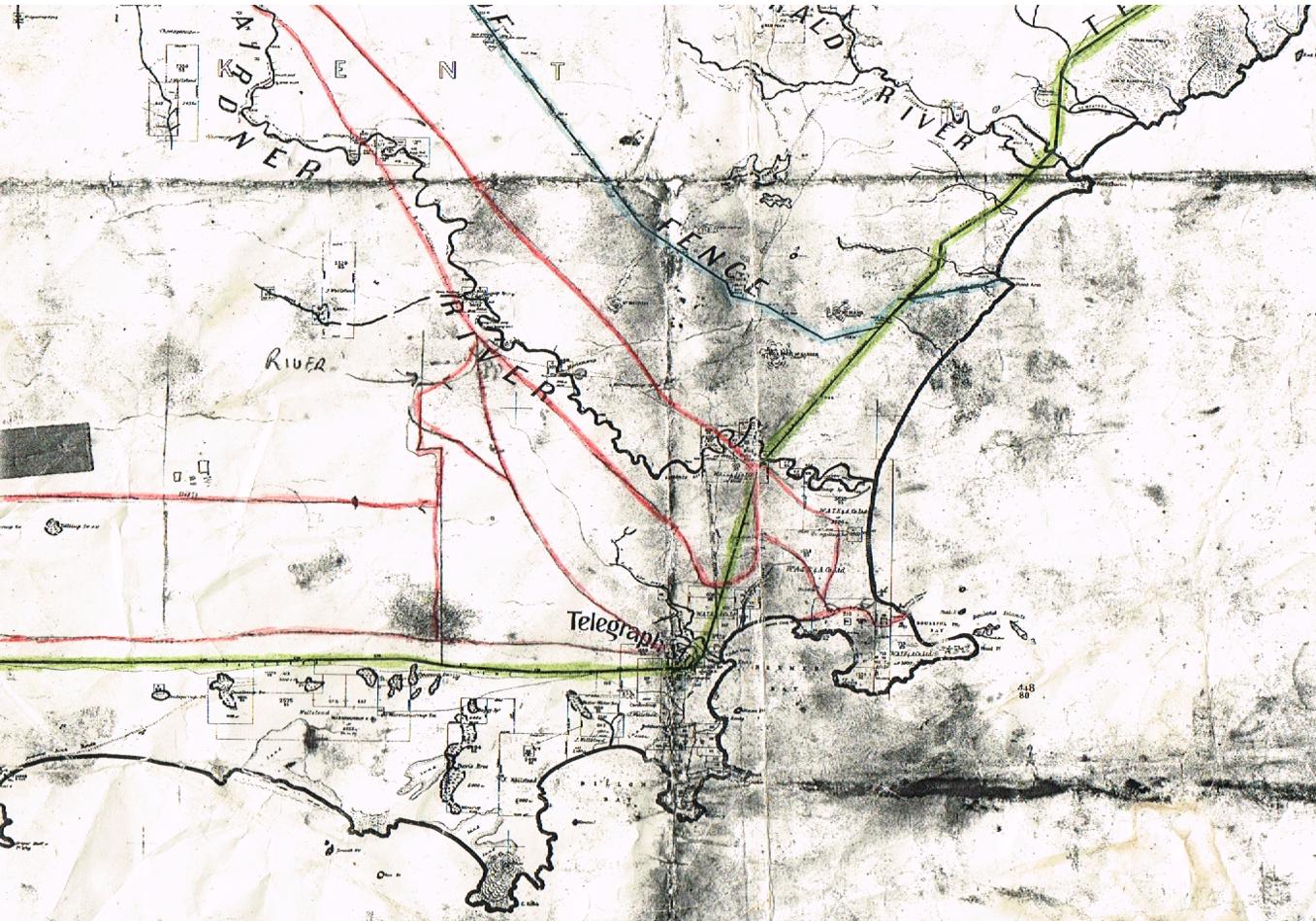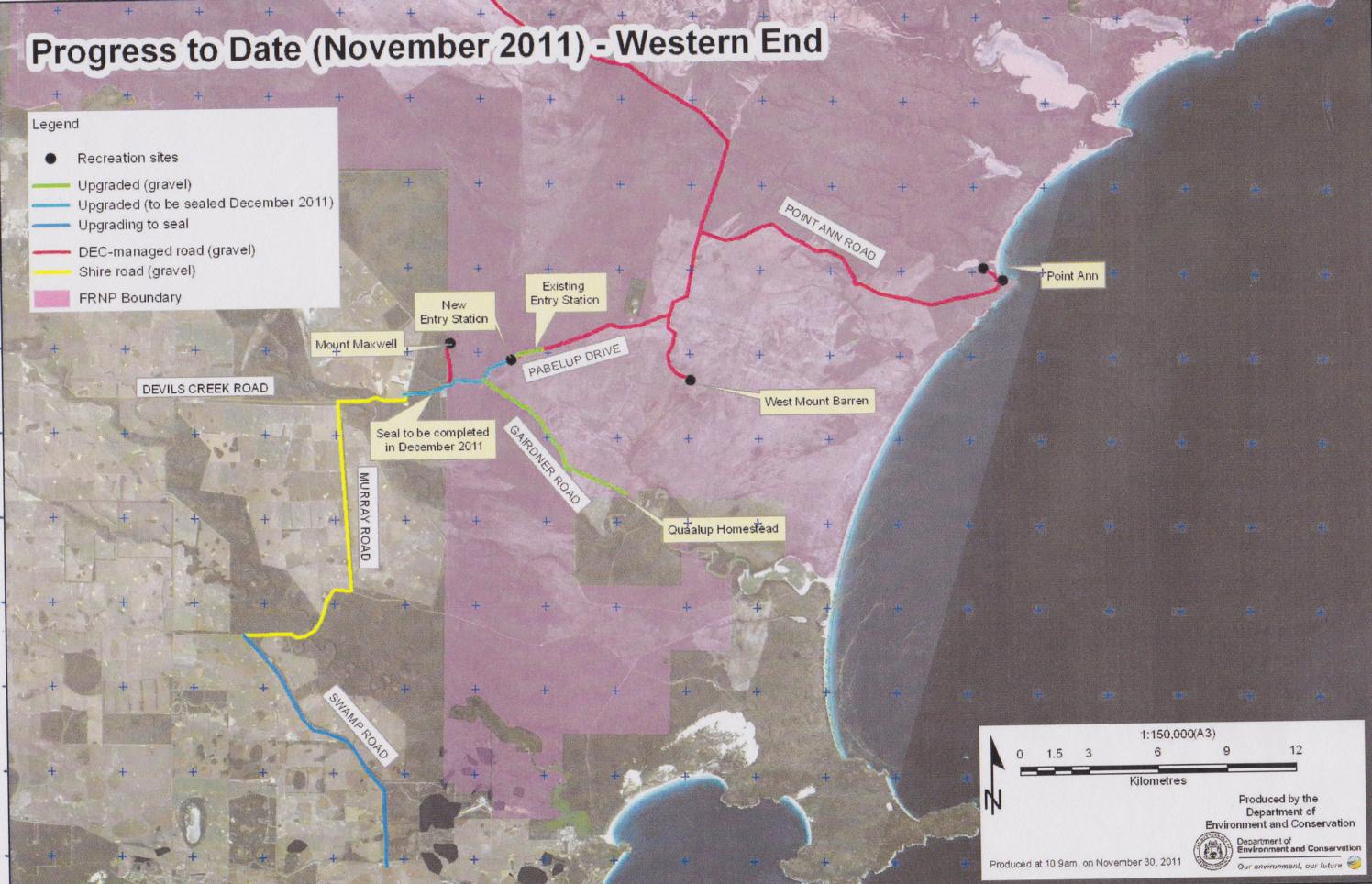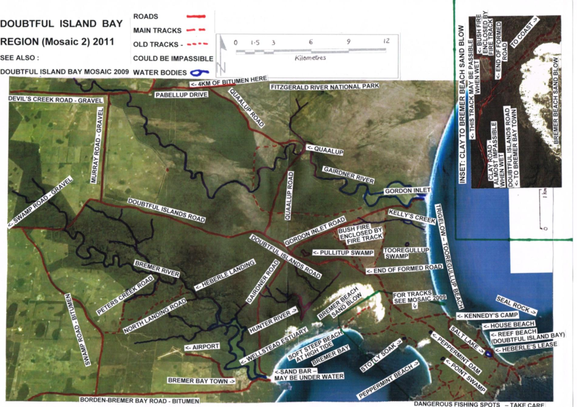 When the river is impassible, access is westwards about 10km along bitumenised Bremer Bay Road, then north east along Swamp Road for about 12km (this section bitumenised 2012), then east along Doubtful Island Road, for about 33km, depending on destination (Trigelow Beach , House Beach, Reef Beach or Drages Beach), see AIR PHOTO 9.