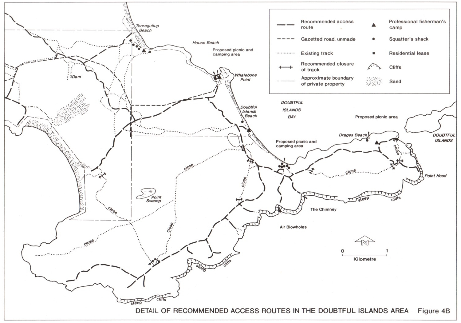 The Doubtful Island track comprises clay pans, which can be impassible in wet weather and sandy tracks which can be boggy when dry. The gravel roads can be very rough, as the sections nearer to Doubtful Island Bay are rarely graded. Access is by 4 wheel drive vehicles or trucks. By contrast, Fitzgerald National Park has many good roads, including some bitumenised, or soon to be bitumenised.