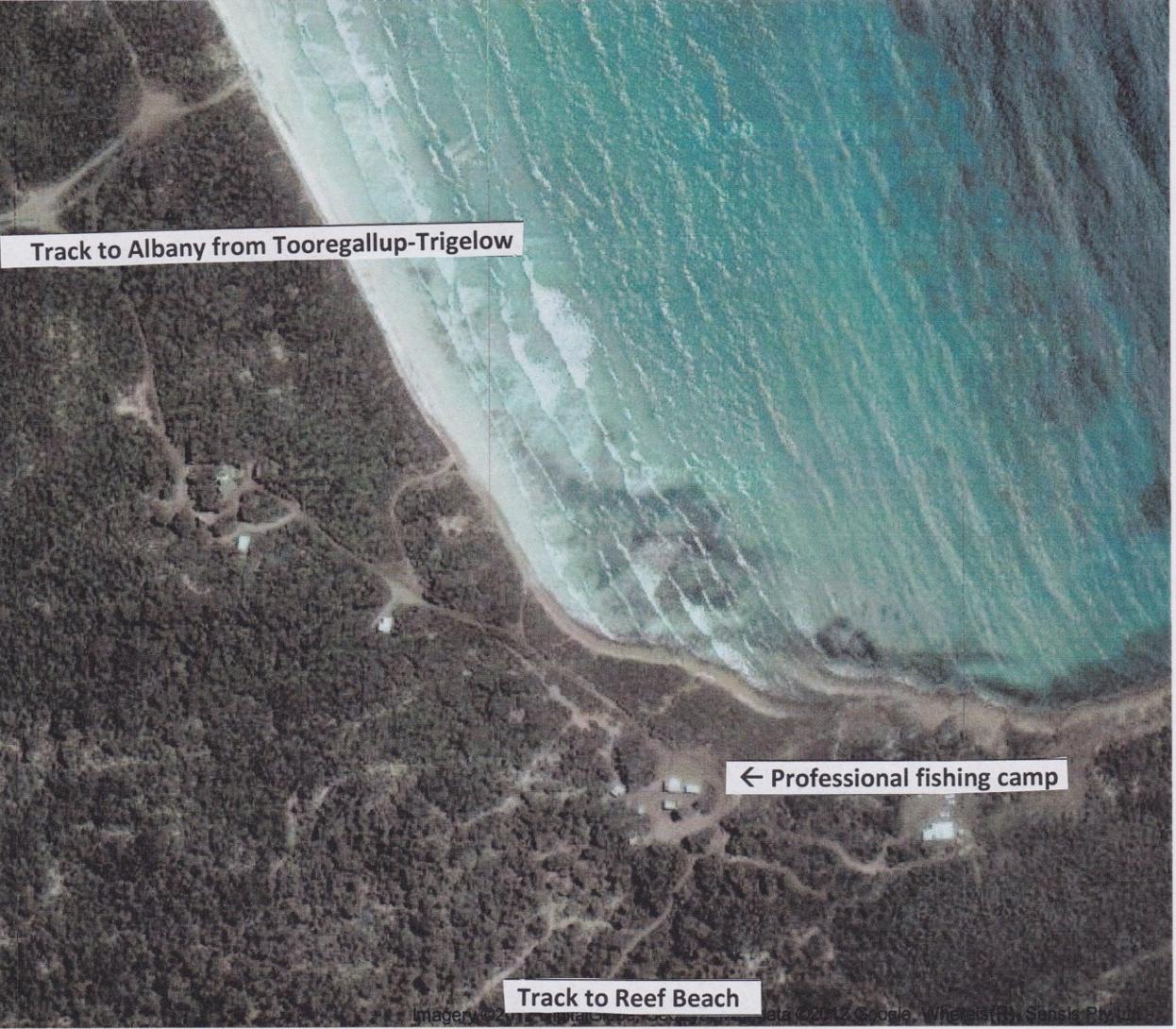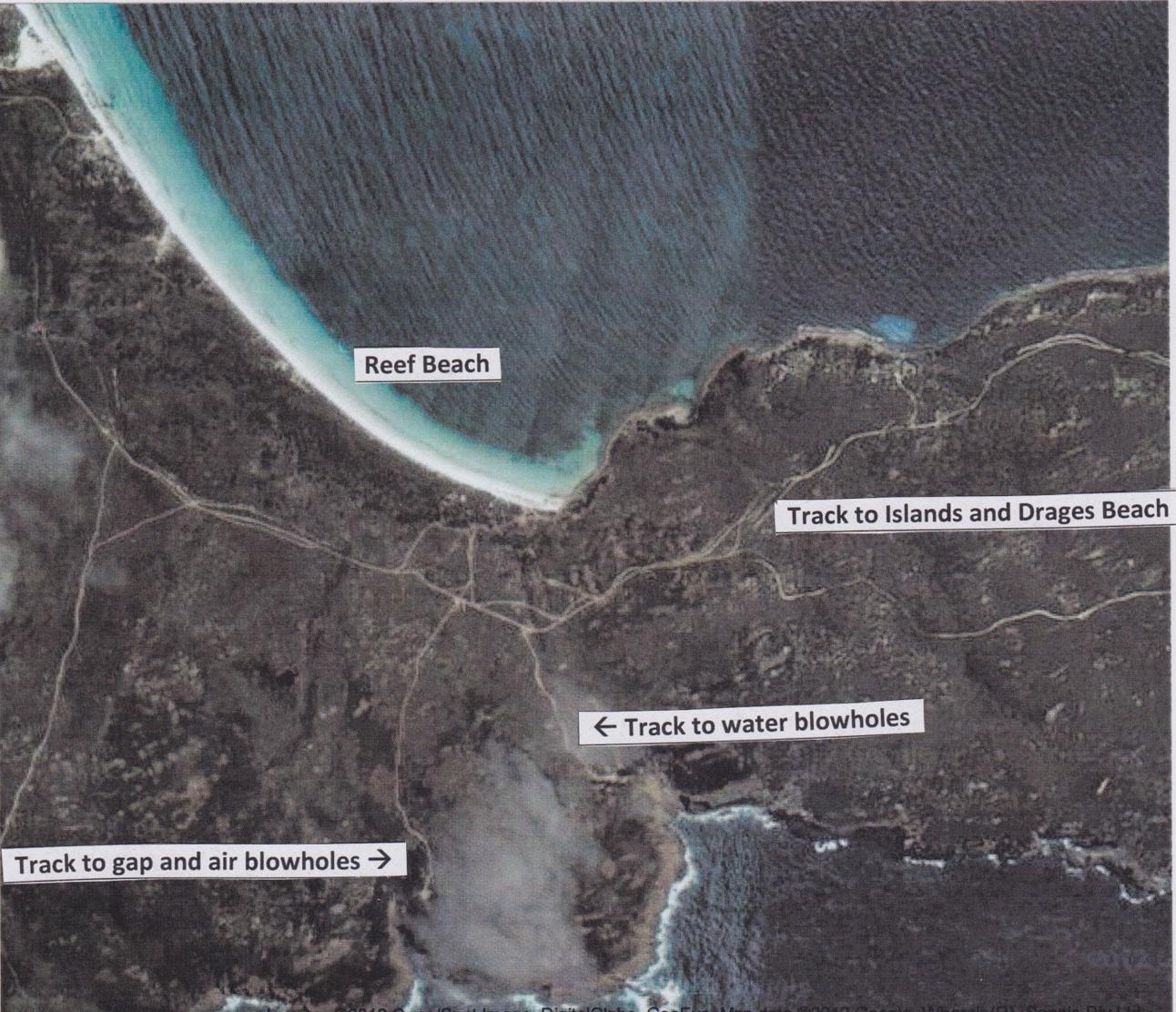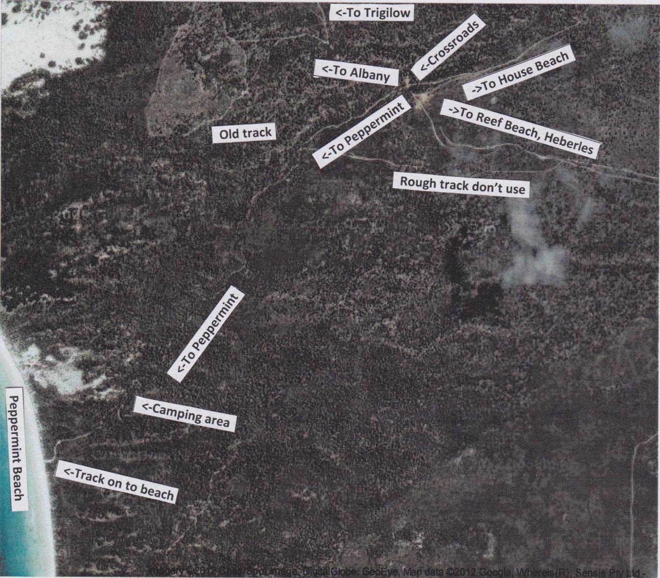 Vehicle access from Bremer Bay is across the Bremer River bar if the river is not running into the sea, then about 11km north on Gairdner (River) Road to the cross roads with Doubtful Island Road, then about 15 km south-east along the Doubtful Island Bay Road and track, depending on destination (to Trigelow Beach , House Beach, Reef Beach or Drages Beach), see AIR PHOTO 9.