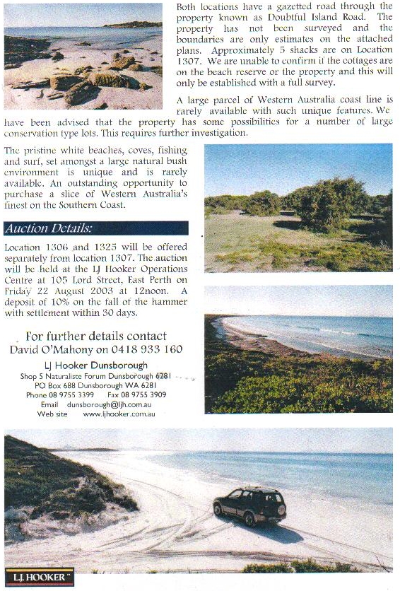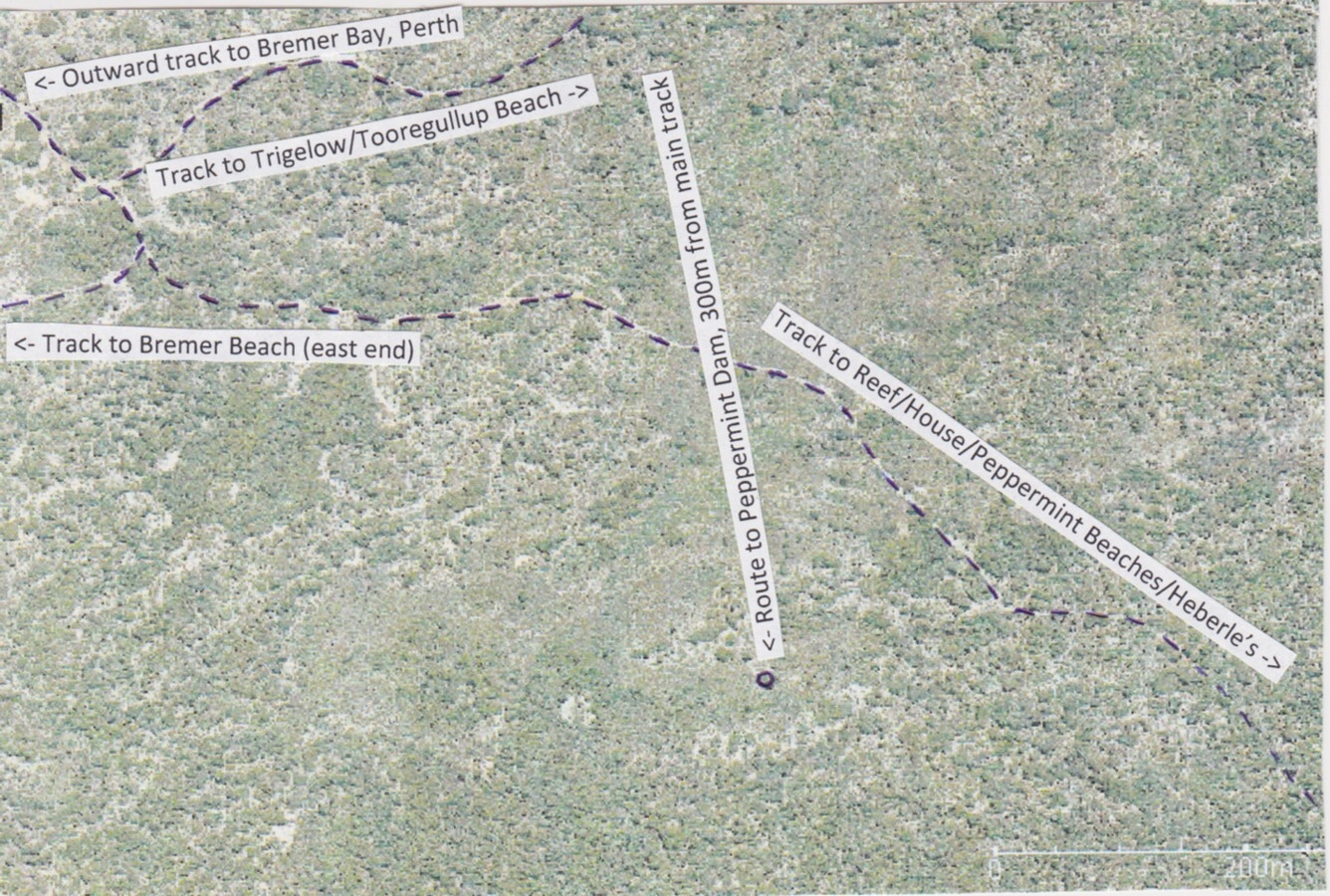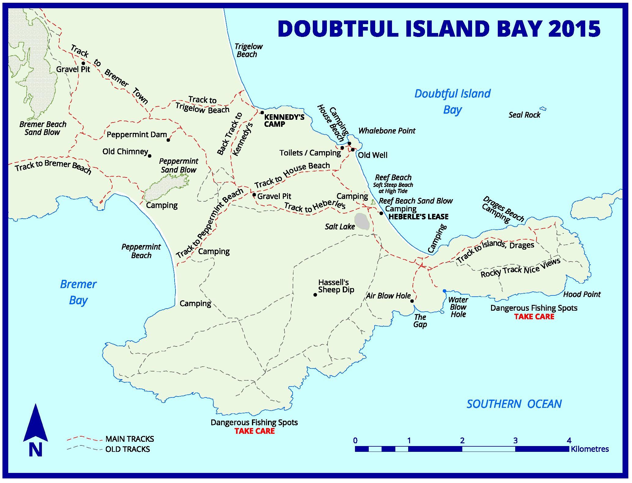 Doubtful Island Bay is about 540km by road, south-east of Perth Post Office. One way there is Perth to Kojonup via Albany Highway, turn east to Broome Hill, then pass through Gnowangerup, Ongerup and Jerramungup. Travel south from Jerramungup and turn off South Coast highway either taking Devils Creek Road (just before Gairdner School) or continue to south past Gairdner School on Gairdner Road South to Bremer Bay Road, then east to Bremer Bay, see MAP 7. Rather than going through Ongerup and Jerramungup, another route is via Chester Pass Road, Borden and Borden-Bremer Bay Road to Bremer Bay and across the Bremer River sand bar (if passable) or via Swamp Road if not.