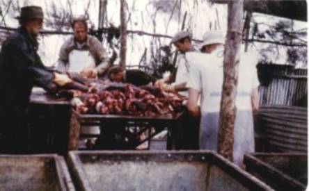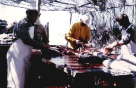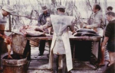 Cleaning salmon in shelter shed at current location, Reef